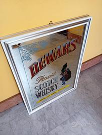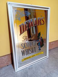 Vendo quadro a specchio Dewar’s Schotch Whisky con cornice in legno, di colore bianco con inserti color argento a specchio, sia frontalmente che lateralmente, le scritte sono incastonate all'interno, elemento di arredo per varie tipologie, dalla casa ad un negozio commerciale oppure birreria o similari.