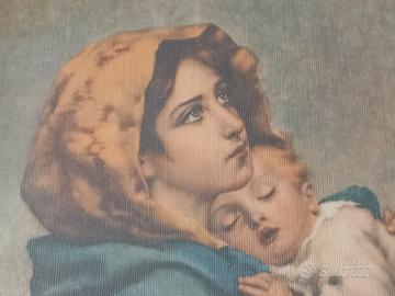 Classico quadro a stampa "Madonna con bambino" tipico e pubblicato in varie versioni in tutta Italia. Stampa su tela cerata impeccabile, dimensioni cm. 22x27, intelaiato su robusta cornice cm. 39x 44,5 anch'essa in condizioni ottime. Unico difetto: 3 macchioline di ruggine sulla tela grigia di contorno al quadro (visibili in foto). Si vende ad Euro 15 in zona Belluno, oppure ottimo robusto imballo e spedizione tracciabile a domicilio in tutta Italia ad Euro 7, oppure presso punto ritiro Inpost ad Euro 5.