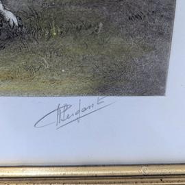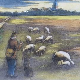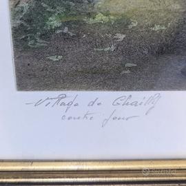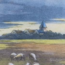 Acquaforte originale colorata a mano, scena pastorale con pastore, cane e gregge in primo piano e villaggio sullo sfondo al tramonto, atmosfera suggestiva e rurale. Sul margine inferiore a matita: dicitura “Eau forte originale”, titolo “Village de Chailly contre jour” e firma dell’artista. Probabile scuola francese, meta' Novecento, in buone condizioni generali