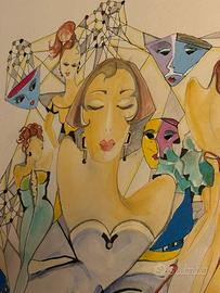 Vendo elegante opera originale del 2018 firmata Roswitha Schulz, realizzata in tecnica mista (acquerello e inchiostro su carta). Il dipinto raffigura figure femminili stilizzate in stile Art Déco / fashion illustration, con colori armoniosi e linee raffinate. Opera molto decorativa, ideale per arredare ambienti moderni, salotti, studi o boutique. Dettagli: - Firma originale in basso a destra - Anno: 2018 - Tecnica: acquerello su carta - Dimensioni con cornice: 43 x 50 cm .ca - Cornice inclusa (blu, pronta da appendere) Provenienza: Opera acquistata direttamente dall’artista presso il suo atelier nel 2019, accompagnata da cartolina di presentazione a cura di Roberto Perdicaro (Artitalia - editrice de L’Élite, storico Annuario d’Arte contemporanea italiana). Artista presente su piattaforme di Arte contemporanea (Gigarte). Condizioni: Perfette Prezzo € 200