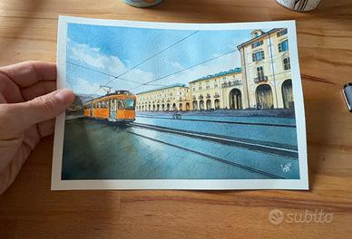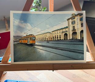 Acquerello originale dipinto a mano, raffigurante un tram storico nel centro di Torino. L’opera nasce da uno studio a matita e viene poi sviluppata ad acquerello, con particolare attenzione alla luce, ai volumi architettonici e all’atmosfera urbana. 23 x 16 cm - su carta 100% cotone da 300gr Ogni dettaglio è realizzato manualmente da me medesimo. L’opera è un pezzo unico, firmato dall’artista. Realizzo opere su commissione nel caso abbiate un soggetto di vostro graeimento non esitate a contattarmi. Volendo posso inquadrare