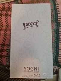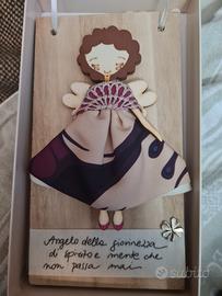 "Vendo splendido Angelo della Giovinezza di spirito e mente che non passa mai, pezzo originale della linea Picà. Si tratta di una creazione artigianale realizzata a mano a Coazze (TO). L'opera è composta da una tavoletta in legno di pioppo su cui è applicata una sagoma di angioletto con vestitino in vera stoffa e dettagli dipinti. Condizioni: Ottime (come da foto). Dimensioni: circa 10x18 cm. Particolarità: Dotato di cordino bianco per essere appeso facilmente. Perfetto come idea regalo carica di significato o per decorare la casa con un tocco poetico.