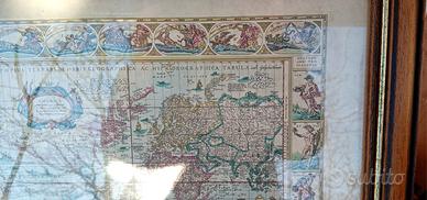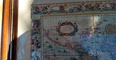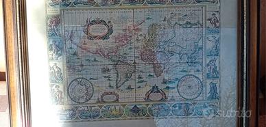 Bellissima mappa antica del mondo incorniciata in legno con vetro.