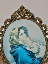 Quadro antico ovale con cornice in ottone decorata e vetro bombato, raffigurante la "Madonnina del riposo", ha luce interna facilmente ripristinabile. In ottime condizioni.