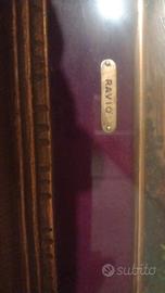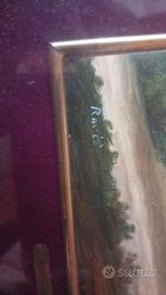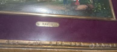Elegante olio su tavola/cartoncino, firmato in basso a sinistra Ravio, raffigurante paesaggio campestre con figure e architettura religiosa. Montato in cornice dorata coeva con passepartout in velluto viola e targhetta con nome dell’autore.