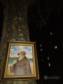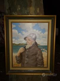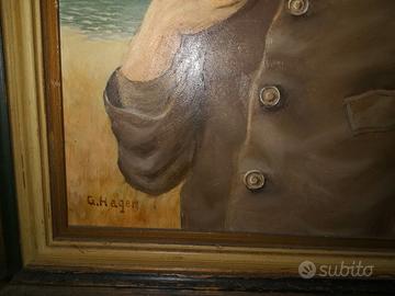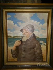 Quadro olio su tela prima metà del 900 a firma G. Hagen. Soggetto: anziano pescatore con pipa in primo piano con sfondo paesaggio marino. Cornice in legno. Dimensioni tela : 40 x 50 cm. Dimensioni cornice: 50 x 60 cm. A partire da 300E. Per informazioni rivolgersi al 3381562893.