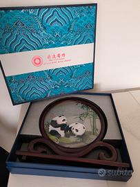 L'oggetto è un ricamo in seta cinese con panda, incorniciato in un supporto di legno circolare. Si tratta di un manufatto artigianale che mostra due panda in un ambiente naturale con bambù.