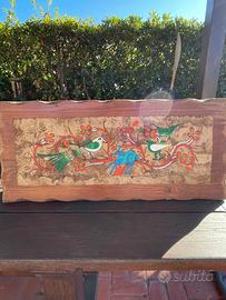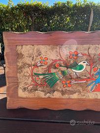 Si tratta di dipinto in stile naif messicano raffigurante uccelli ed altri uccelli su carta amate un tipo di carta tradizionale ricavata dalla corteccia. L’oggetto è montato su tavola di legno.