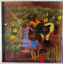 Dipinto di abitanti di un villaggio balinese che raccolgono paglia di riso