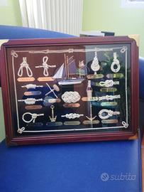 rappresentazione principali nodi e oggetti marinari con targhette dei nomi dei nodi in ottone,ancora in ottone su base in Alcantara blu e cornice i legno di mogano e angolari di protezione in ottone davvero bello !