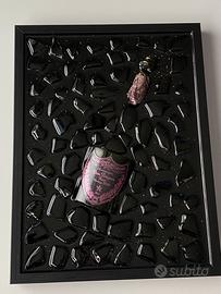 "Opera d'arte in resina epossidica fatta a mano con integrazione di bottiglia Dom Pérignon. Cornice nera. Pezzo unico, perfetto per arredamento moderno, bar o lounge."Perfetto anche come idea regalo originale per chi ama l'arte moderna e il design. • Dimensioni: 30×40 cm