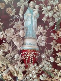La struttura ceramica ben colorata è al centro del quadro e poggia su di un altarino rosso cosi mentre bordò è il tessuto che riveste internamente il quadro.