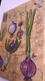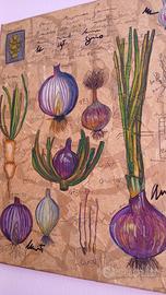 Questo quadro raffigura diverse varietà di cipolle e bulbi, illustrate con tratti precisi e colorazioni vibranti che spaziano dal verde brillante al viola intenso. Ogni dettaglio — dalle radici ai germogli — racconta la bellezza della natura nella sua forma più autentica.