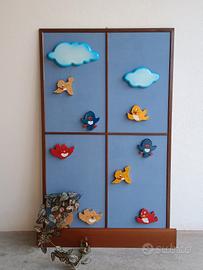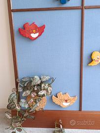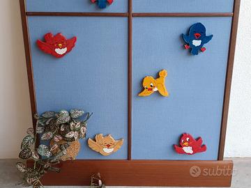 Quadro artigianale per camera bambini raffigurante una finestra, usato ma in ottimo stato e senza difetti. Il quadro è formato da compensato rivestito in stoffa con applicazione di uccellini e nuvole in legno di Bartolucci. In una camera per bambini è di sicuro effetto. Prezzo € 30,00. Ritiro a Ferrara a carico dell'acquirente, non spedisco perché potrebbe danneggiarsi