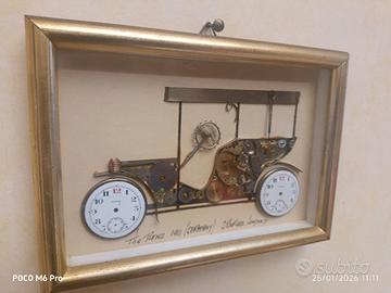 Opera artigianale realizzata con autentici ingranaggi e componenti meccanici di orologeria, assemblati in una composizione verticale che richiama la forma di un orologio antico. Al centro è presente un quadrante con numeri romani, circondato da elementi metallici e dettagli industriali, creando un equilibrio tra estetica vintage e design steampunk. La struttura è racchiusa in una cornice dorata, che esalta il contrasto tra il fondo chiaro e i toni caldi del metallo. L’opera è firmata dall’artista e datata, rendendola un pezzo unico e originale, ideale come elemento decorativo per ambienti moderni, industriali o vintage.