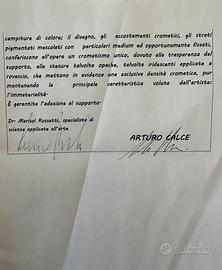 Vendesi come da titolo quadro originale di Arturo Calce, dal titolo "The Maternity", anno 2014, di dimensioni 90x130cm, per cambio arredamento casa. In vendita con relativo certificato di autenticità firmato dall'autore che ne comprova l'originalità (il nome sul certificato è della persona che l'ha acquistato e che farà la vendita, non essendo pratico di internet io mi sono occupato di fare l'annuncio ma poi la trattativa sarà con il venditore stesso). Arturo Calce è un artista multidisciplinare che utilizza la vernice spray su lastre di plexiglass. Questo processo tattile e intricato consiste nel somministrare strati di pigmenti cromatici dal retro dell'immagine, che poi apparirà alla fine, seguendo un processo inverso a quello del pittore sulla tela. Queste lastre retro-dipinte con forme nitide su un supporto trasparente sono tecnicamente e concettualmente uniche e permettono una circolazione di luce ed energia rara. L'opera pittorica, originariamente bidimensionale, si apre ad una seconda dimensione e assume profondità grazie alla lastra trasparente. La sua arte, stilisticamente a cavallo tra pop art ed espressionismo, si avvicina anche alla Street art nell’uso delle bombolette spray, pur delineandosi come living art, arte da interni.