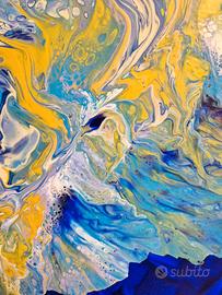 Questo quadro 30 x 60 cm acrilico su tela presenta energia e raffinatezza ideale ai tuoi spazi realizzato con la tecnica Acrilico Fluido e rivestito con la resina epossidica. I vibranti toni del blu ultramarine, beige e oro, combinati con delicate sfumature e una texture affascinante, creano un effetto visivo dinamico e coinvolgente.
