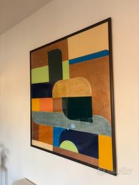 Vendo quadro astratto originale dipinto a mano con colori acrilici su tela. Dimensioni importanti: 105,5 × 115,5 cm, perfetto sopra divano/credenza o per studio/ufficio. Palette moderna con contrasti caldi e blu/verde, stile geometrico contemporaneo.