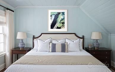 L’opera trasmette calma, equilibrio e introspezione, evocando atmosfere notturne e naturali allo stesso tempo. Il contrasto tra il blu intenso e il verde salvia crea profondità visiva, mentre gli inserti argento donano luminosità e movimento, cambiando effetto a seconda dell’illuminazione dell’ambiente.