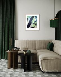 Quadro astratto originale caratterizzato da profonde tonalità di blu notte, armonizzate con delicate sfumature di verde salvia e raffinati dettagli argento che riflettono la luce con discreta eleganza.