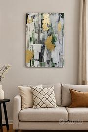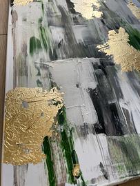 Quadro astratto originale, realizzato con tecnica mista su tela.Colori neutri (bianco, nero, grigio, verde) combinati a inserti di foglia oro che aggiungono luminosità e carattere. Perfetto per ambienti moderni, minimal o industrial, ideale per dare un tocco elegante e contemporaneo a soggiorno, camera da letto o ufficio.
