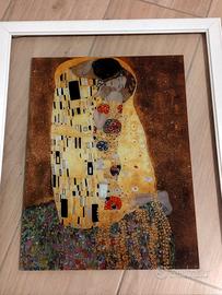 Vendo quadro raffigurante Il Bacio di Klimt. Cornice bianca, dipinto separato da una superficie trasparente dalla cornice.
