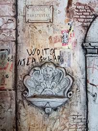 È uno dei suoi tipici bassorilievi polimaterici che rappresenta il Rione Trastevere in Via della Luce.