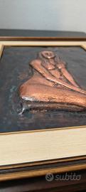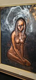 Elegante opera artigianale in rame sbalzato a mano, risalente agli anni '70. Raffigura un nudo femminile stilizzato con bellissimi riflessi ambrati e bruniture originali. Dettagli: Firmato dall'artista in basso. Cornice: In legno originale dell'epoca (ottime condizioni). Misure: Circa 48x38 cm. Stile: Modernariato / Mid-Century. Pronto da appendere. Un pezzo unico di grande impatto decorativo.