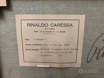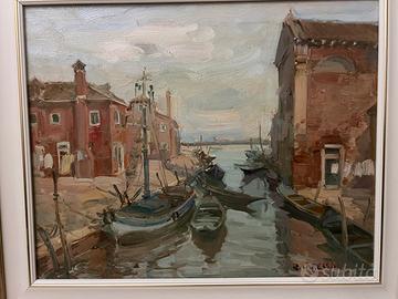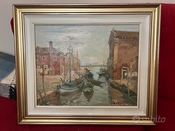 Quadro olio su tela del 1979 rappresenta burano. Rinaldo caressa aveva una casa a Venezia ed ha conosciuto tutti i pittori della valigia. Solo la tela misura 50x40 cm. Condizioni perfette. La chiesa dei cappuccini o santa maria delle grazie è stata sconsacrata. I quadri che rappresentano la venezia e la laguna sono i più belli.
