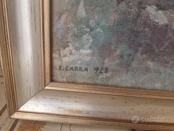 Il quadro raffigura un paesaggio rurale con un casolare e alberi, ed è un'antica coppia di dipinti a olio su tela dell'artista C.Carrà risalenti al 1900. L'opera è descritta come un incantevole scorcio di campagna, con un casolare e un cortile, probabilmente della stessa abitazione, immersi in campi fioriti e con le colline sullo sfondo.