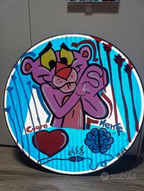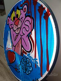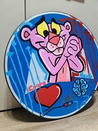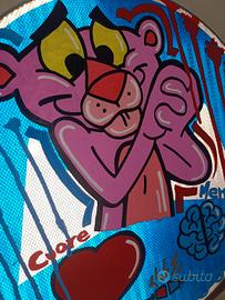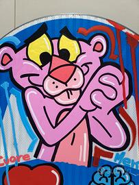 Il personaggio animato della Pantera Rosa, raffigurato con uno stile audace e colori vivaci, tipico della pop art e della street art.