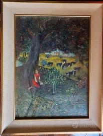 cm 30 x 50 circa. Non riesco a fare bene la foto col vetro sul quadro. Allora l'ho fatta in piu' modi, per non far venire il riflesso nello stesso posto. Attualmente è a Oricola / Abruzzo, sulla A24. Altrimenti a Roma Zona EUR - Torrino