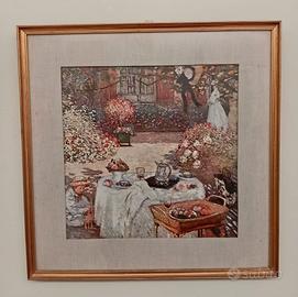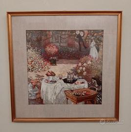 Quadro dipinto, completo di cornice dorata con vetro raffigurate all’interno un giardino, con fiori, con una sposa vestita di bianco, una bambina con cappello con il nastro, una tavola semi apparecchiata ecc., dimensioni del quadro sono cm 45 x cm 45.