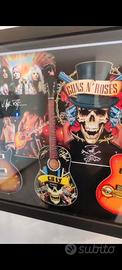 Bellissimo complemento d'arredo, composizione di 3 chitarre in legno da 15 cm l'una personalizzate dei Guns n Roses e immagini del gruppo. Cornice del quadro in legno con cornice spessa 4 cm. Dimensioni circa 25x25