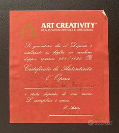 Quadro con cornice misura cm 45 x 45 realizzato su foglia oro zecchino 985/1000 come da certificazione allegata all’opera.