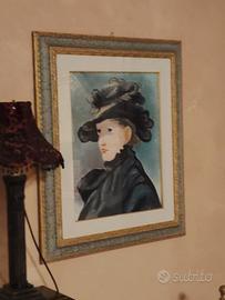 quadro con dipinto, soggetto Donna con cappello..splendida cornice in legno con sfumature azzurro -dorato...un pezzo inseribile in ogni genere di arredamento.. stupendo....