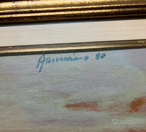 Dipinto raffigurante un paesaggio veneziano con gondola. - Scene con gondola e persone. - Cornice dorata. Misure della cornice 67x57x6