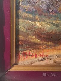 piccolo dipinto firnato in rosso, olio su tavoletta di cartone rigido