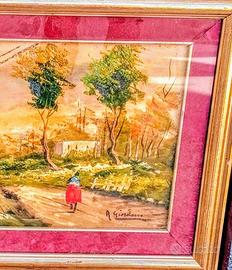 Quadro con paesaggio e contadina dipinto a mano.