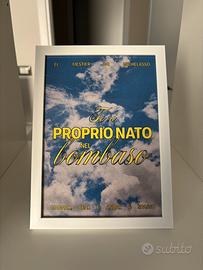 Un tocco di leggerezza e ironia per i tuoi spazi: questo poster presenta la frase dialettale "te si proprio nato nel bombaso", stampata su uno sfondo azzurro cielo con soffici nuvole.