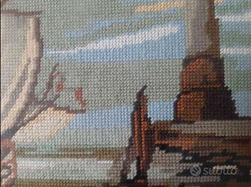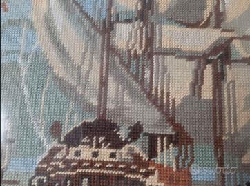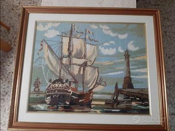 Quadro ricamato a mezzo punto è tema marino raffigurante velieri e faro, dimensioni cm 54 x 64, compreso di cornice.