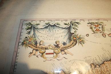 Vendo bellissimo quadro con riproduzione della Trinacria incorniciata con pregiata cornice con doppio vetro. La cornice misura 85 x 73 cm ed è alta circa 2 cm, mentre la riproduzione misura 42 x 33 cm. Questa riproduzione di una stampa antica (originale di Coronelli del 1685) è stata impressa con il torchio a mano su carta pregiata e acquarellata a mano da pittori esperti della tipografia Firenze Stampa. Vedi foto allegate