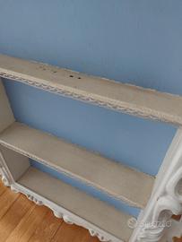 Quadro con scaffali in stile shabby chic. Legno, verniciato bianco/azzurro. 3 Scaffali: la più alta ha una profondità di 4 cm, l'altri due di 6,5 cm. 49 x 67 x 9 cm circa Vedi foto per le condizioni del quadro. solo ritiro a mano