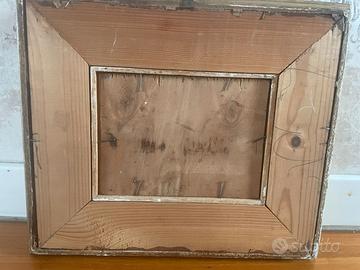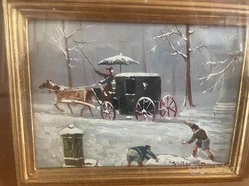 Completo di cornice (un po’ rovinata), vetro e passepatout. Olio (credo) rappresentante scena invernale. Firmato