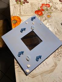 Quadro con specchio in legno azzurro conchiglie e pesci