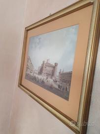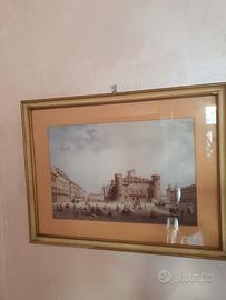 Vendo elegante quadro d'epoca da parete, contenente una suggestiva riproduzione storica di Piazza Castello a Torino. Un complemento d'arredo raffinato, perfetto per gli amanti della storia sabauda, del collezionismo locale o per dare un tocco classico a un salotto o a uno studio professionale. Caratteristiche: Struttura: Stampa d'epoca protetta da vetro, valorizzata da un ampio passepartout color salmone/pesca che dona profondità all'immagine. Il tutto è racchiuso in una cornice in legno chiaro con eleganti finiture e profili dorati. Dettagli: L'illustrazione ritrae una veduta ottocentesca di Piazza Castello con Palazzo Madama in primo piano (lato facciata medievale con le torri). La scena è animata da minuziosi dettagli di vita quotidiana dell'epoca, con carrozze, cavalli e figure in abiti storici. Condizioni: Il quadro si presenta in ottime condizioni estetiche generali. Essendo un oggetto vintage, la cornice può presentare impercettibili segni del tempo che ne certificano l'autenticità e il fascino. Vetro integro. Pronta da appendere. Ritiro a mano a Torino (zona Santa Rita) o spedibile con adeguato imballaggio. Disponibile per altre foto. Prezzo trattabile.