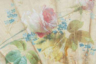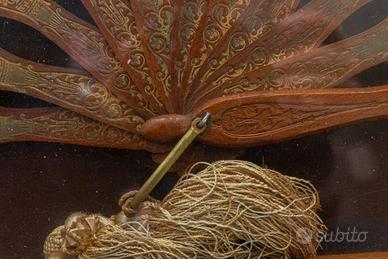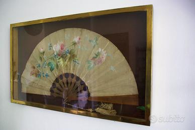 Questo ventaglio antico con cornice è un pezzo squisito, caratterizzato da un delicato disegno floreale dipinto a mano sulla superficie del ventaglio, che cattura un classico fascino vintage. Gli intricati intagli e i dettagli dipinti in oro sulle stecche in legno aggiungono un tocco di eleganza e artigianalità. Alloggiato in una cornice di 50x47 cm, questo pezzo pesa tra 4 e 5 kg e costituirebbe un'eccellente aggiunta a una collezione di decorazioni antiche o accenti interni unici.