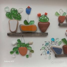 quadro con soggetti in vetri e maioliche lavorate dal mare. realizzato a mano e rifinito con pittura acrilica, cornice bianca con doppio fondo misure 20x15 cm