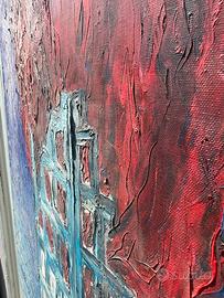 Vendo un dipinto originale in stile espressionista/post-impressionista, firmato in basso a sinistra. L’opera raffigura un paesaggio urbano notturno dominato da un elemento rosso infuocato, simile a un sole o una luna di sangue, che incombe su un edificio con finestre illuminate. Le pennellate dense e i colori vibranti creano un’atmosfera intensa e drammatica, evocando temi di distruzione o pericolo.