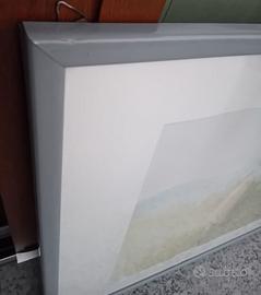 Vendo quadro con cornice di colore grigio, con vetro frontale, si tratta probabilmente di una stampa astratta oppure una litografia, la firma dell'artista non riesco a decifrarla . Misura in larghezza 70,5 cm, altezza 52 cm.